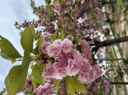 朝日に映える 最後に咲く八重桜が満開になりました♪